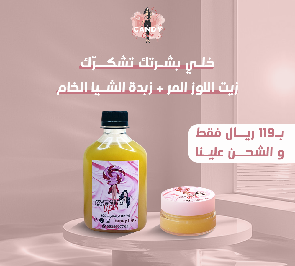 دلّلي بشرتك بجمال الطبيعة مع باكدج زيت اللوز المر وزبدة الشيا الخام من كاندي كير. تركيبة طبيعية 100% تمنحك عناية متكاملة، ترطيب عميق، وتفتيح فعّال لمناطق الجسم الداكنة بلمسة فاخرة.